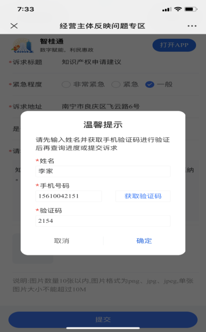 4.完成填写,通过“提交”按钮,进行姓名和手机号验证。